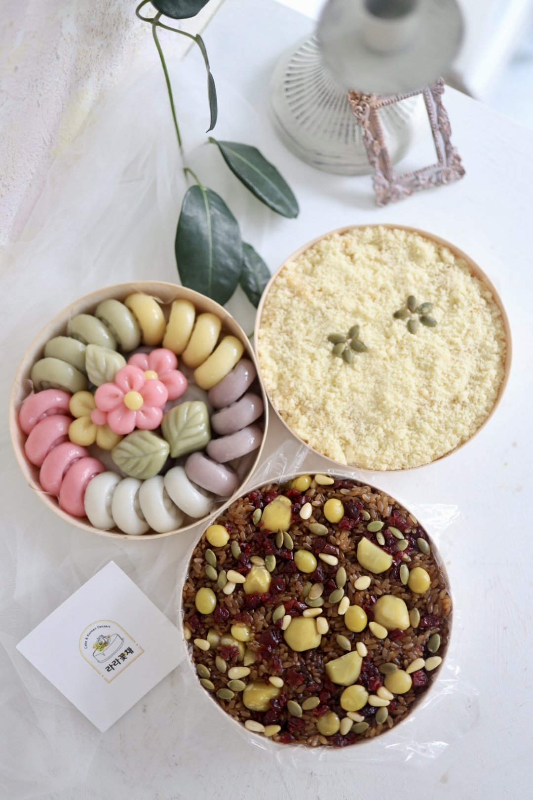 - 전통약식(850g) 1상자 + 오색도장송편(30개) 1상자 + 단호박인절미(600g) 1상자 3단 1세트