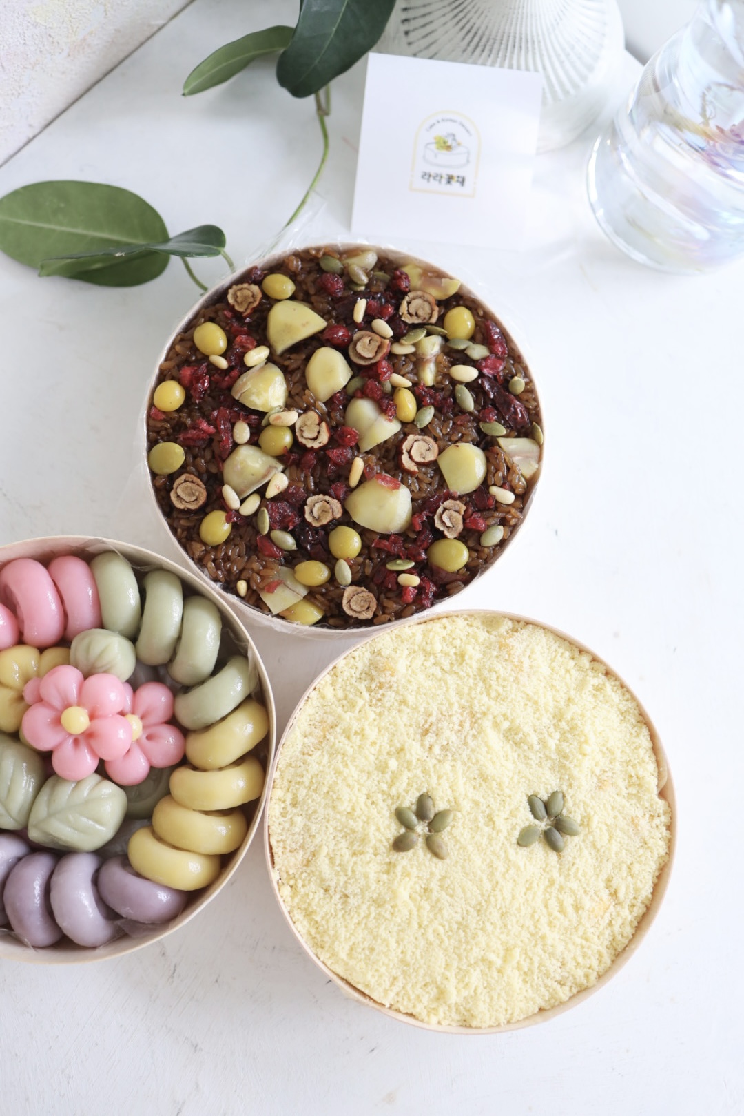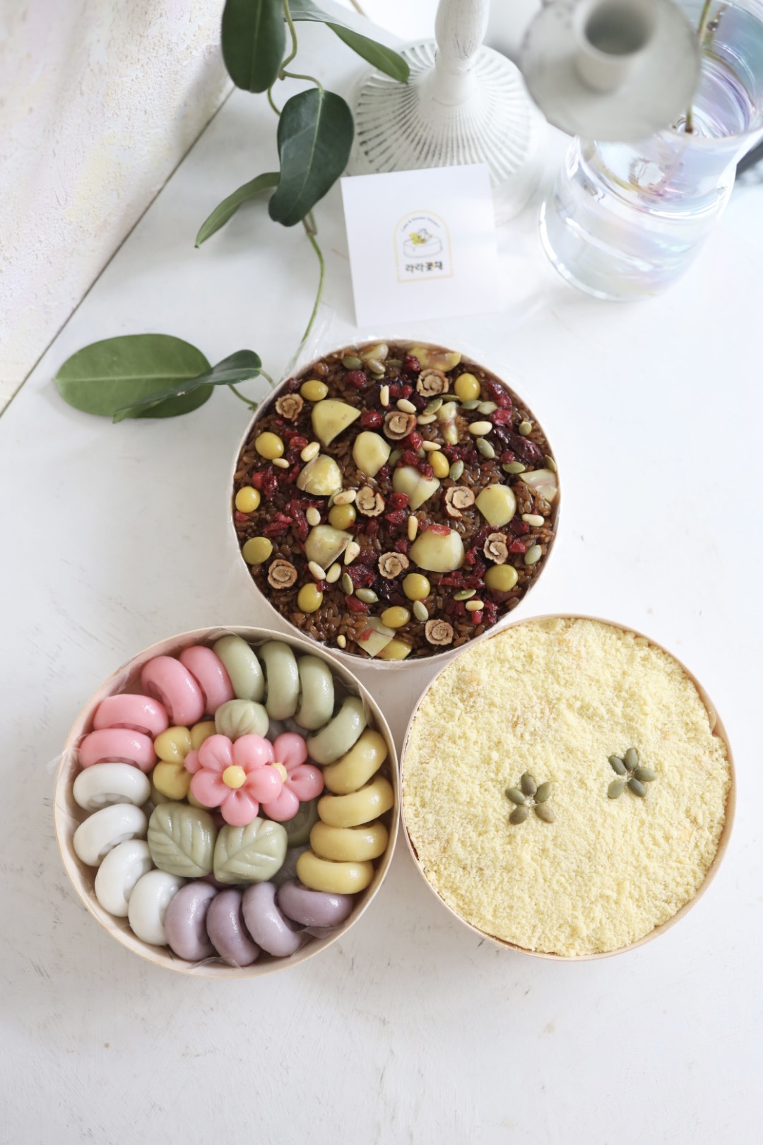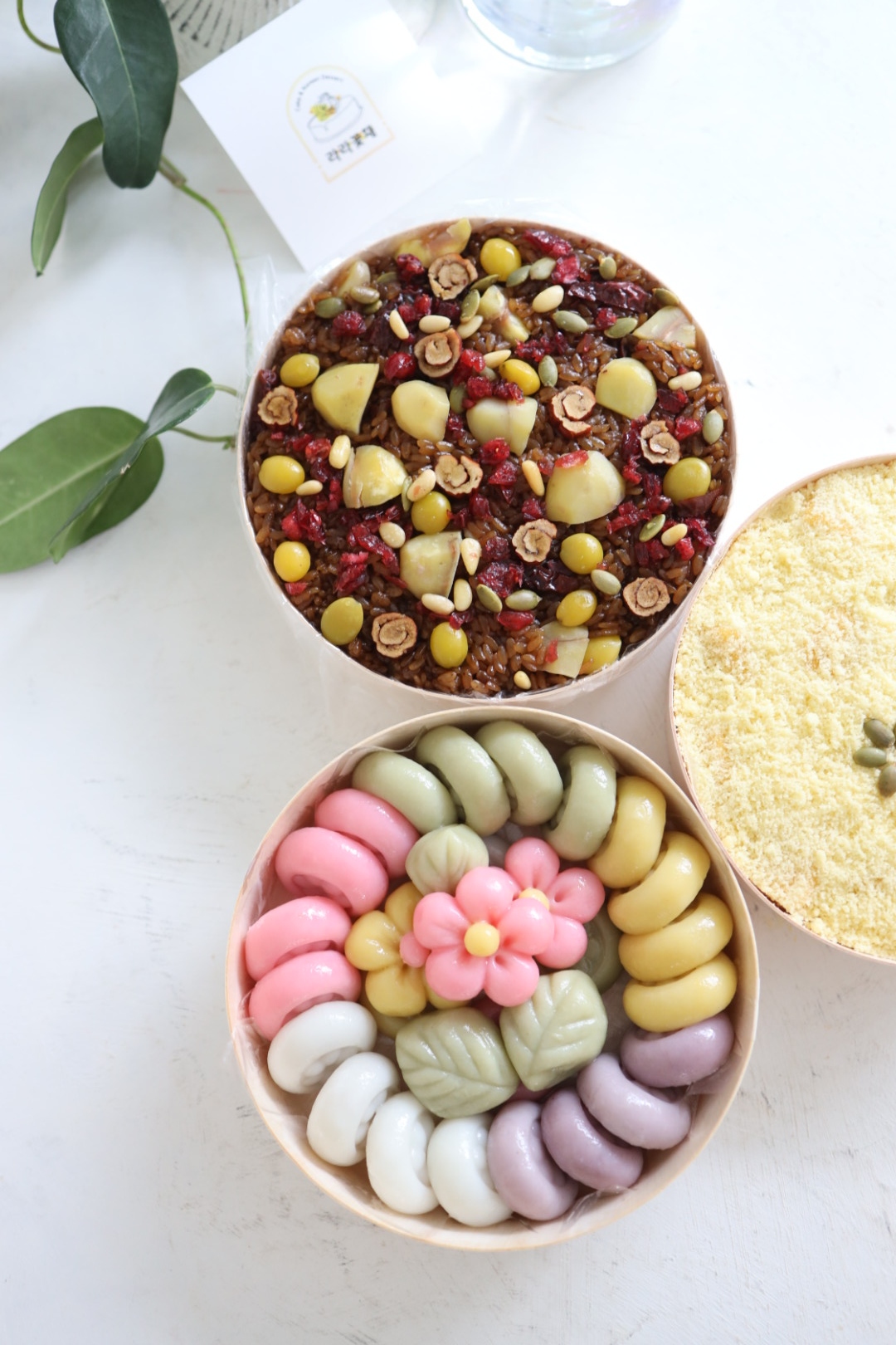 - 전통약식(850g) 1상자 + 오색도장송편(30개) 1상자 + 단호박인절미(600g) 1상자 3단 1세트
