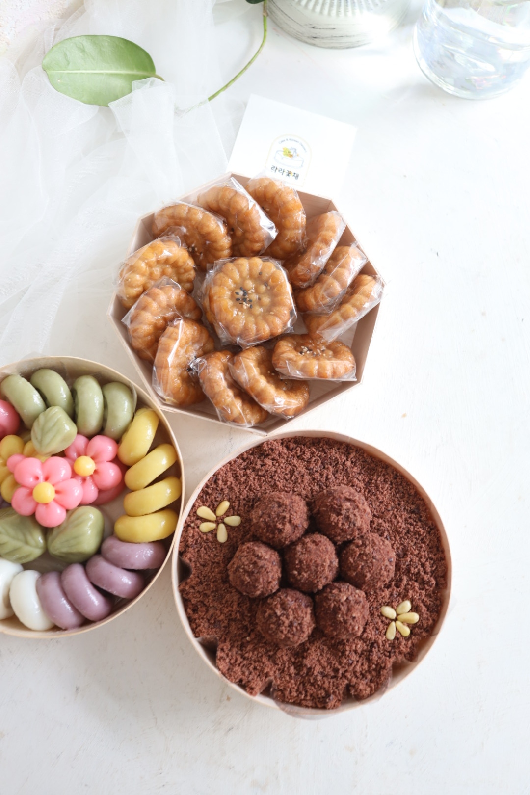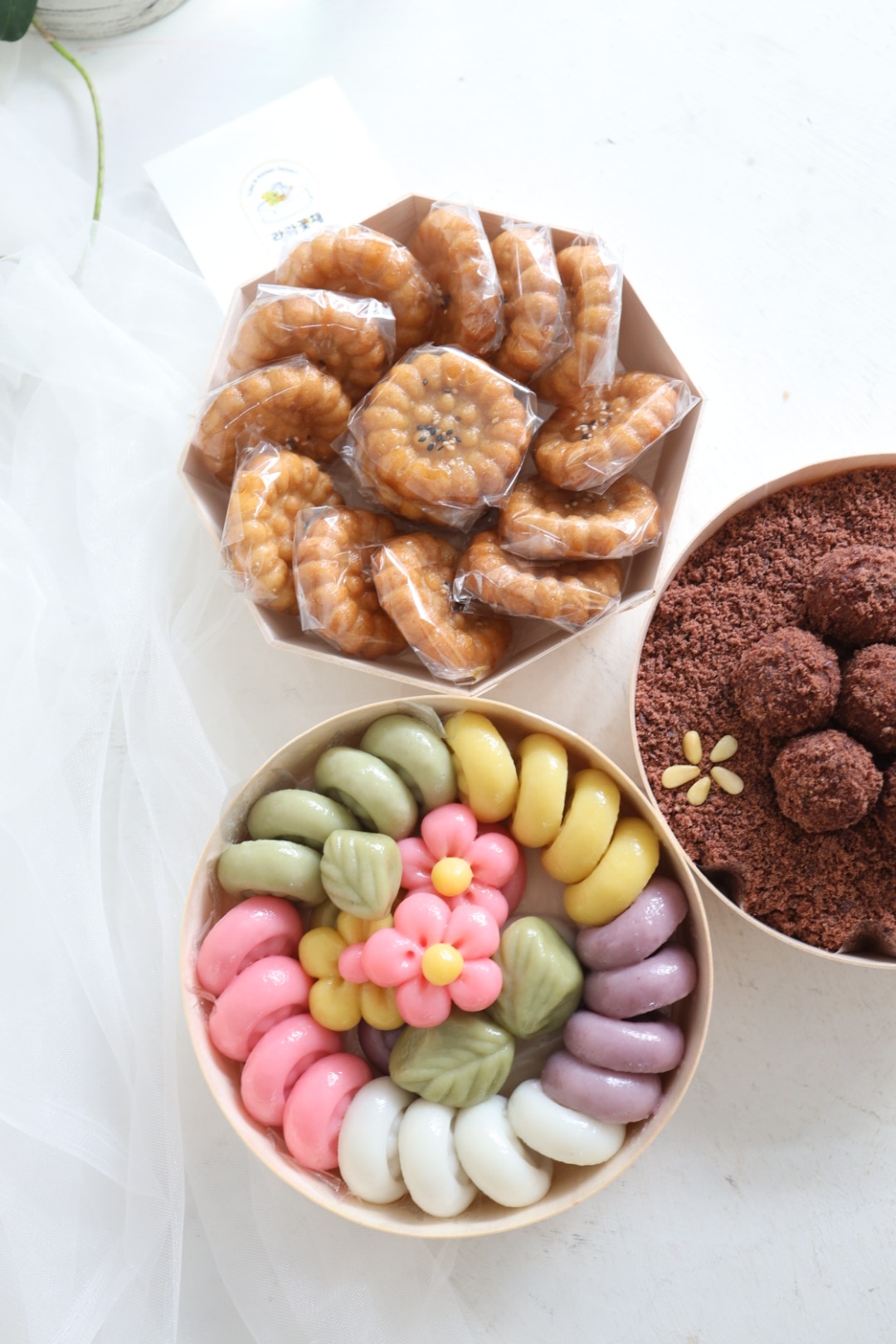 - 찹쌀약과(상온 일주일 이내/냉동 3주 이내), 오색도장송편, 찰수수팥떡(픽업일 당일 섭취)