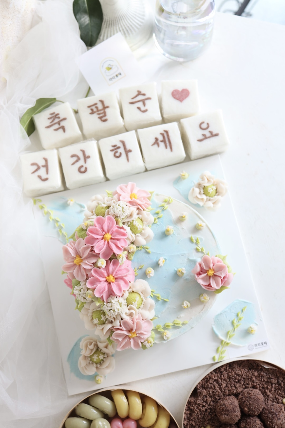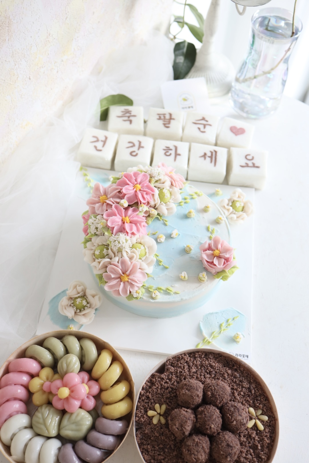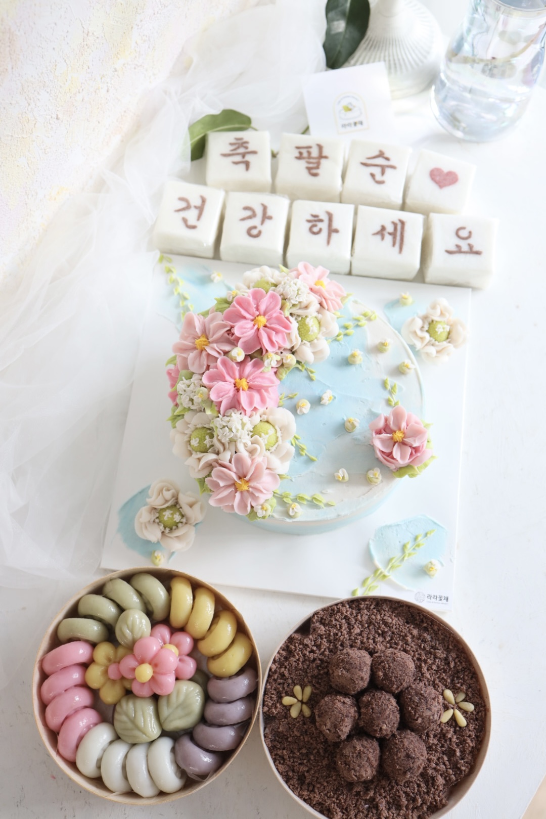 - 앙금꽃(아황산류,흰강낭콩,유제품), 백설기-패턴글씨(코코아가루, 홍국쌀가루, 딸기가루), 송편(깨,꿀,잣), 찰수수팥떡-팥, 장식(잣)