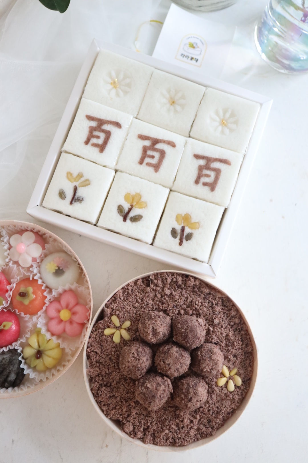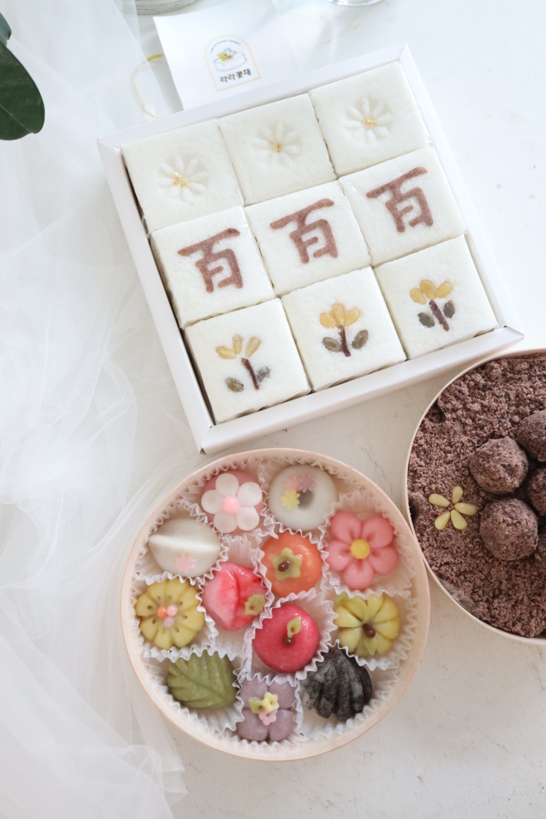 상차림떡 > 상차림떡 백일 상차림떡-a(꽃송편) NEW BEST 제품종류 백일 판매가 113,000원 보관방법 드시기 전까지 상온보관 소비기한 픽업일 당일 섭취 알레르기 주의 백설기-패턴글씨(코코아가루)/장식(잣,대추,호박씨), 송편(깨,꿀,잣), 찰수수팥떡-장식(잣) 포장단위 백설기(9조각) 1상자, 꽃송편(12개) 1상자, 찰수수팥떡(27개) 1상자 기타 - 백설기 패턴 글씨 변경 가능하고, 패턴 제작이 필요할 경우 별도 추가금액 있습니다. - 단품으로도 주문 가능합니다. 카카오채널 문의하기 카카오채널 문의하기 다음글 > 백일 상차림떡 3종세트-D(꽃송편-밤) < 이전글 백일 조각설기 1상자 목록 ▲ ▼