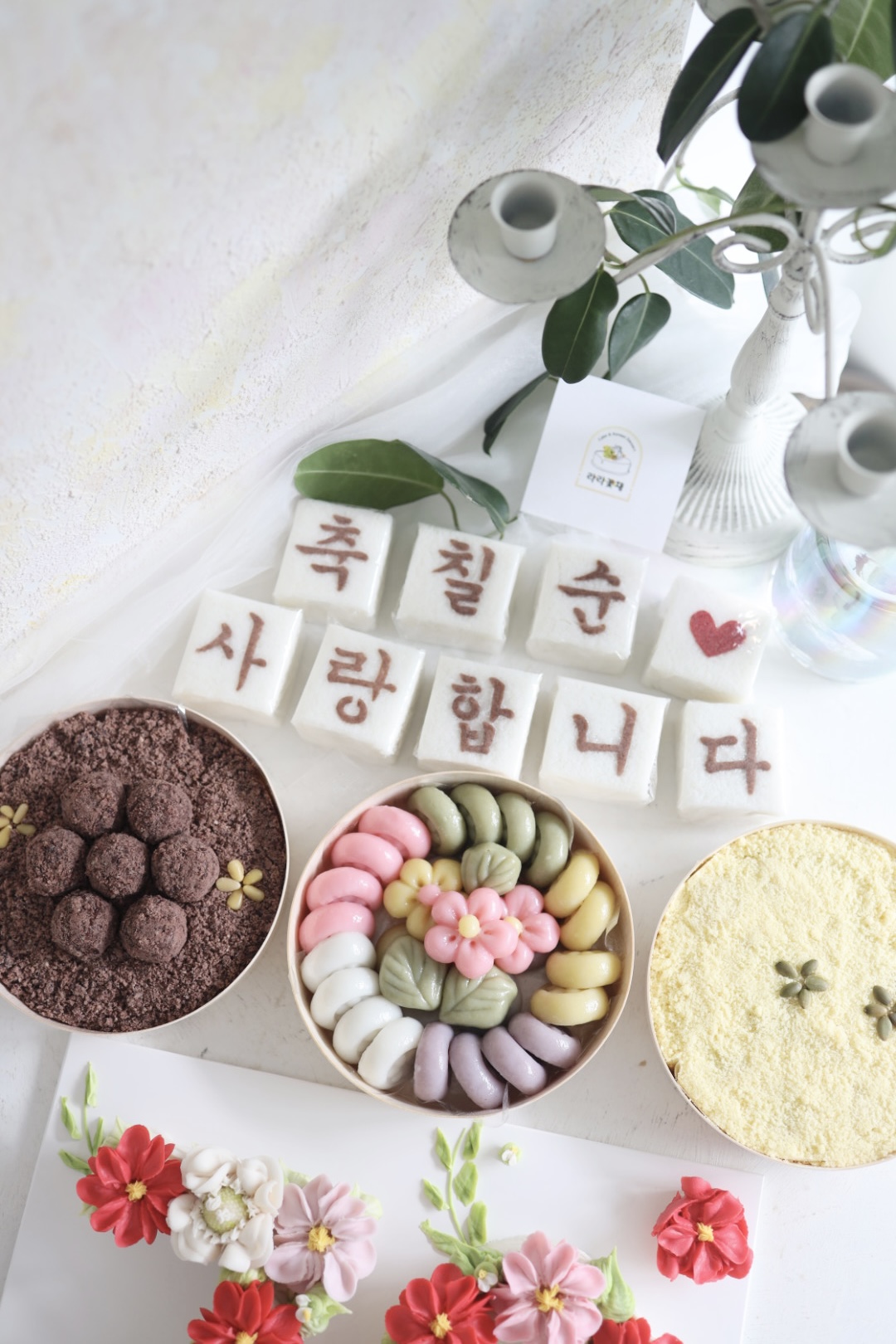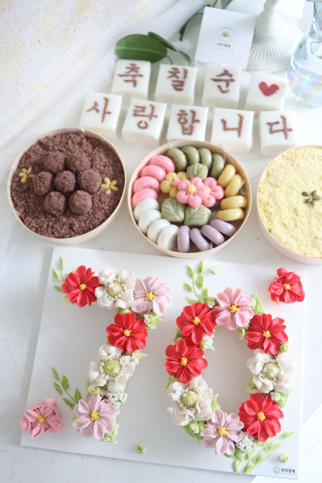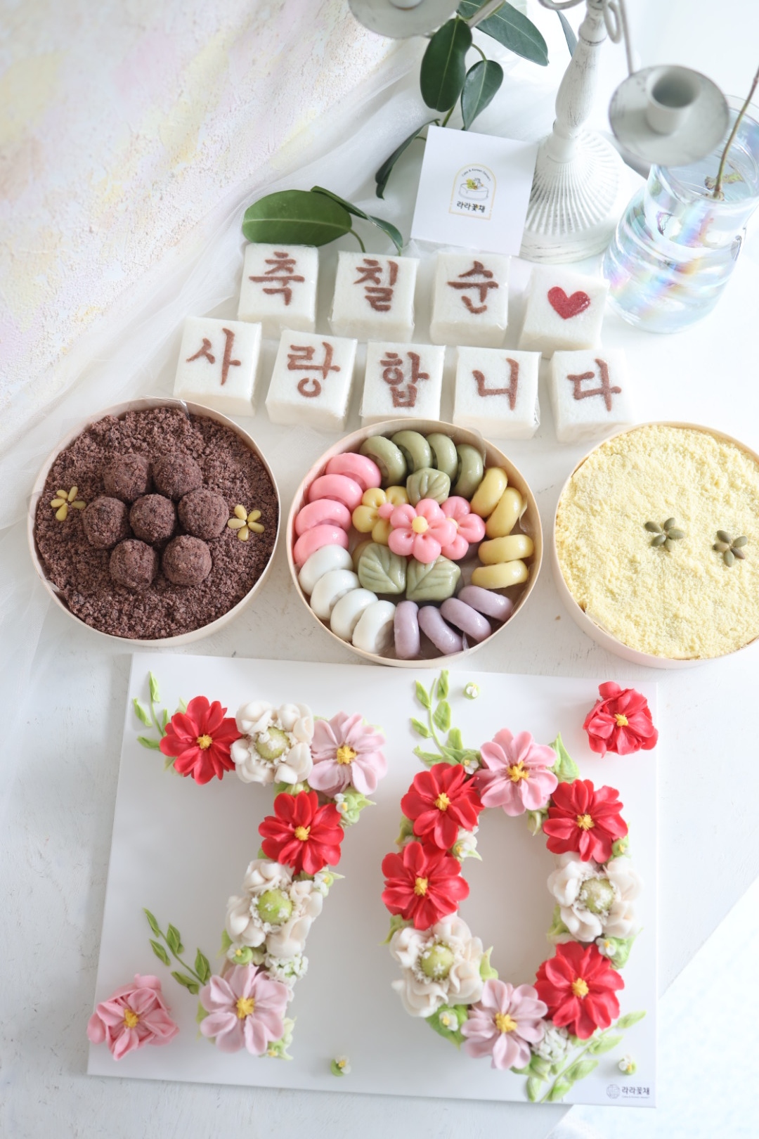 상차림떡 > 상차림떡 70 숫자케이크와 상차림떡 4종세트 NEW BEST 제품종류 칠순(고희) 판매가 232,000원 보관방법 드시기 전까지 상온보관 소비기한 픽업일 당일 섭취 알레르기 주의 앙금꽃(아황산류,흰강낭콩,유제품), 백설기-패턴글씨(코코아가루, 홍국쌀가루, 딸기가루), 송편(깨,꿀,잣), 찰수수팥떡-장식(잣), 단호박인절미-쌀카스테라고물(밀가루,계란,유제품)/장식(호박씨) 포장단위 숫자케이크(두글자), 백설기(9조각) 1상자, 오색도장송편(30개) 1상자, 찰수수팥떡(27개/650g) 1상자, 단호박인절미(600g) 1상자 기타 - 백설기 패턴 글씨 변경 가능하고, 패턴 제작이 필요할 경우 별도 추가금액 있습니다. - 단품으로도 주문 가능합니다. - 숫자케이크는 기본 백설기로 제작됩니다. - 숫자케이크 기본구성 : 옆면+윗면 앙금크림 아이싱, 추가금액 없이 투명박스 포장 후 리본(랜덤), 케이크칼(성냥), 숫자초-2개 * 하판레터링은 선택사항으로 별도 추가금액 있습니다. - 하판레터링 출력 후 부착 > 첫 주문시 +1천원 - 하판레터링 12글자 이내 작성 > +3천원 카카오채널 문의하기 카카오채널 문의하기 < 이전글 2호 핀작약 청자 항아리 떡케이크 목록 ▲ ▼