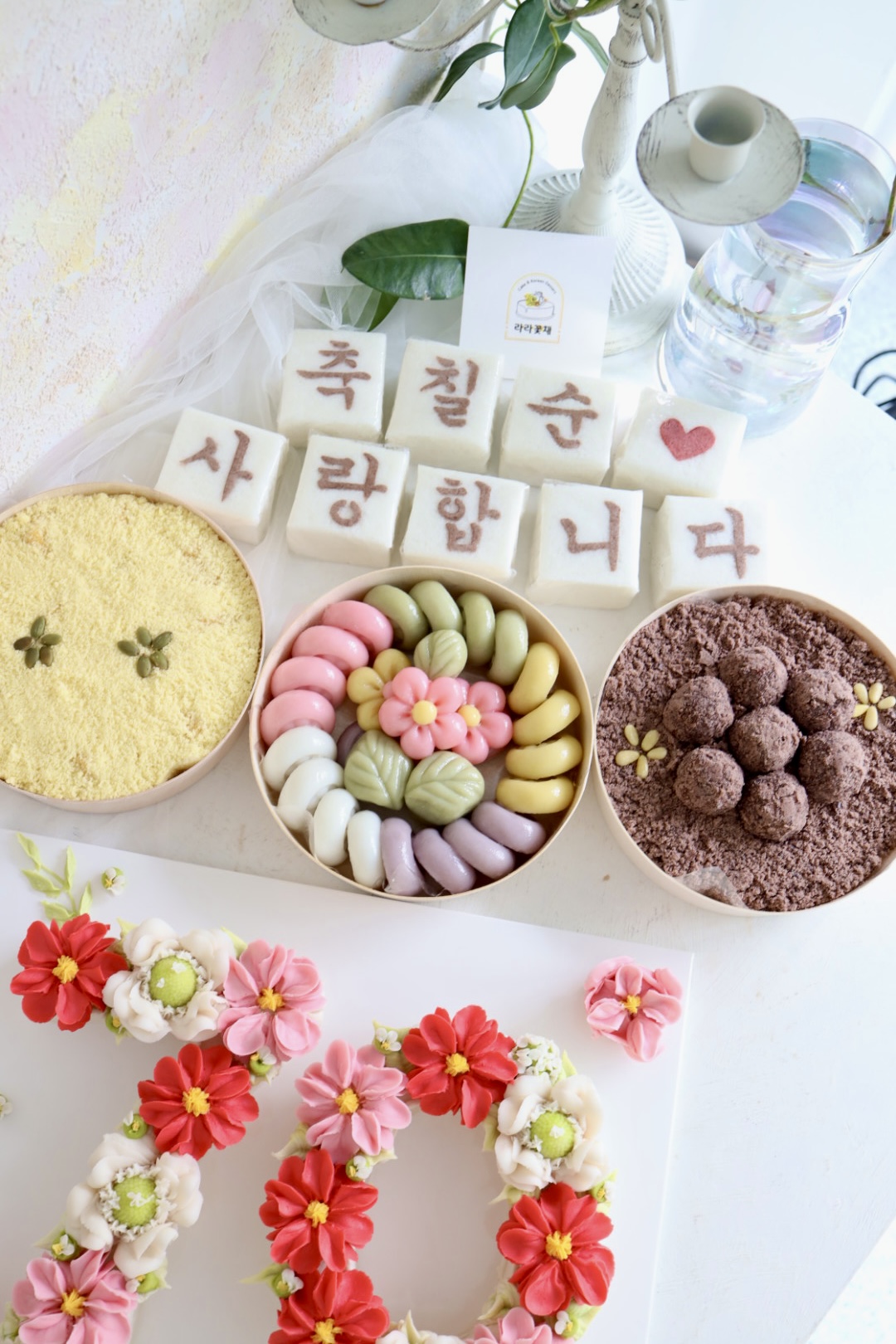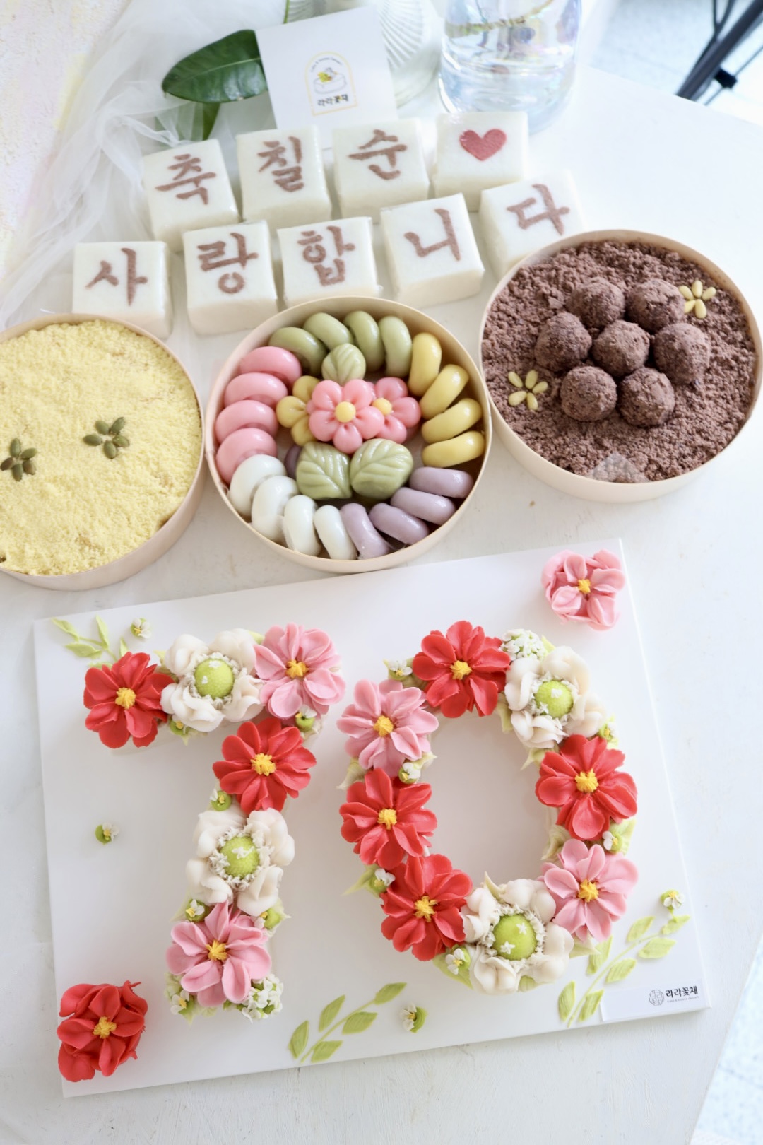 상차림떡 > 상차림떡 70 숫자케이크와 상차림떡 4종세트 NEW BEST 제품종류 칠순(고희) 판매가 232,000원 보관방법 드시기 전까지 상온보관 소비기한 픽업일 당일 섭취 알레르기 주의 앙금꽃(아황산류,흰강낭콩,유제품), 백설기-패턴글씨(코코아가루, 홍국쌀가루, 딸기가루), 송편(깨,꿀,잣), 찰수수팥떡-팥/장식(잣), 단호박인절미-쌀카스테라고물(밀가루,계란,유제품)/장식(호박씨) 포장단위 숫자케이크(두글자), 백설기(9조각) 1상자, 오색도장송편(30개) 1상자, 찰수수팥떡(27개/650g) 1상자, 단호박인절미(600g) 1상자 기타 - 백설기 패턴 글씨 변경 가능하고, 패턴 제작이 필요할 경우 별도 추가금액 있습니다. - 단품으로도 주문 가능합니다. - 숫자케이크는 기본 백설기로 제작됩니다. - 숫자케이크 기본구성 : 옆면+윗면 앙금크림 아이싱, 추가금액 없이 투명박스 포장 후 리본(랜덤), 케이크칼(성냥), 숫자초-2개 * 하판레터링은 선택사항으로 별도 추가금액 있습니다. - 하판레터링 출력 후 부착 > 첫 주문시 +1천원 - 하판레터링 12글자 이내 작성 > +3천원 카카오채널 문의하기 카카오채널 문의하기 다음글 > 3호 반전떡케이크와 상차림떡 3종세트 < 이전글 2호 핀작약 청자 항아리 떡케이크 목록 ▲ ▼