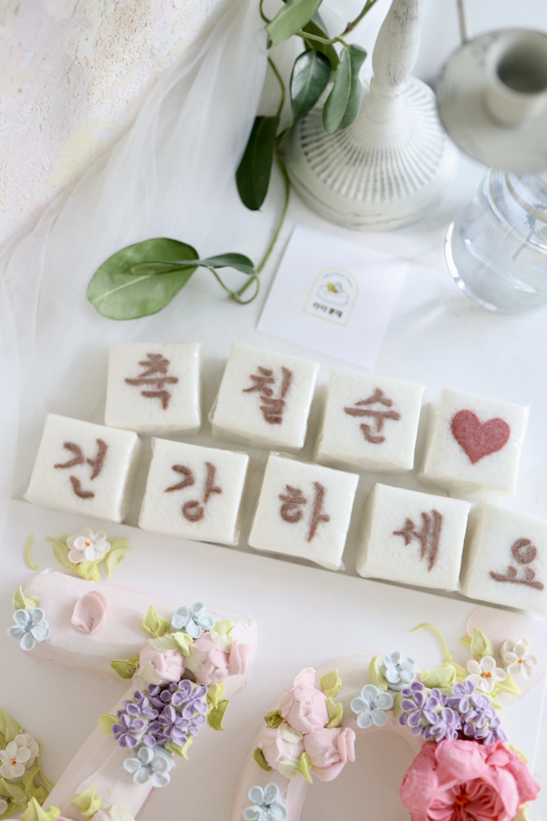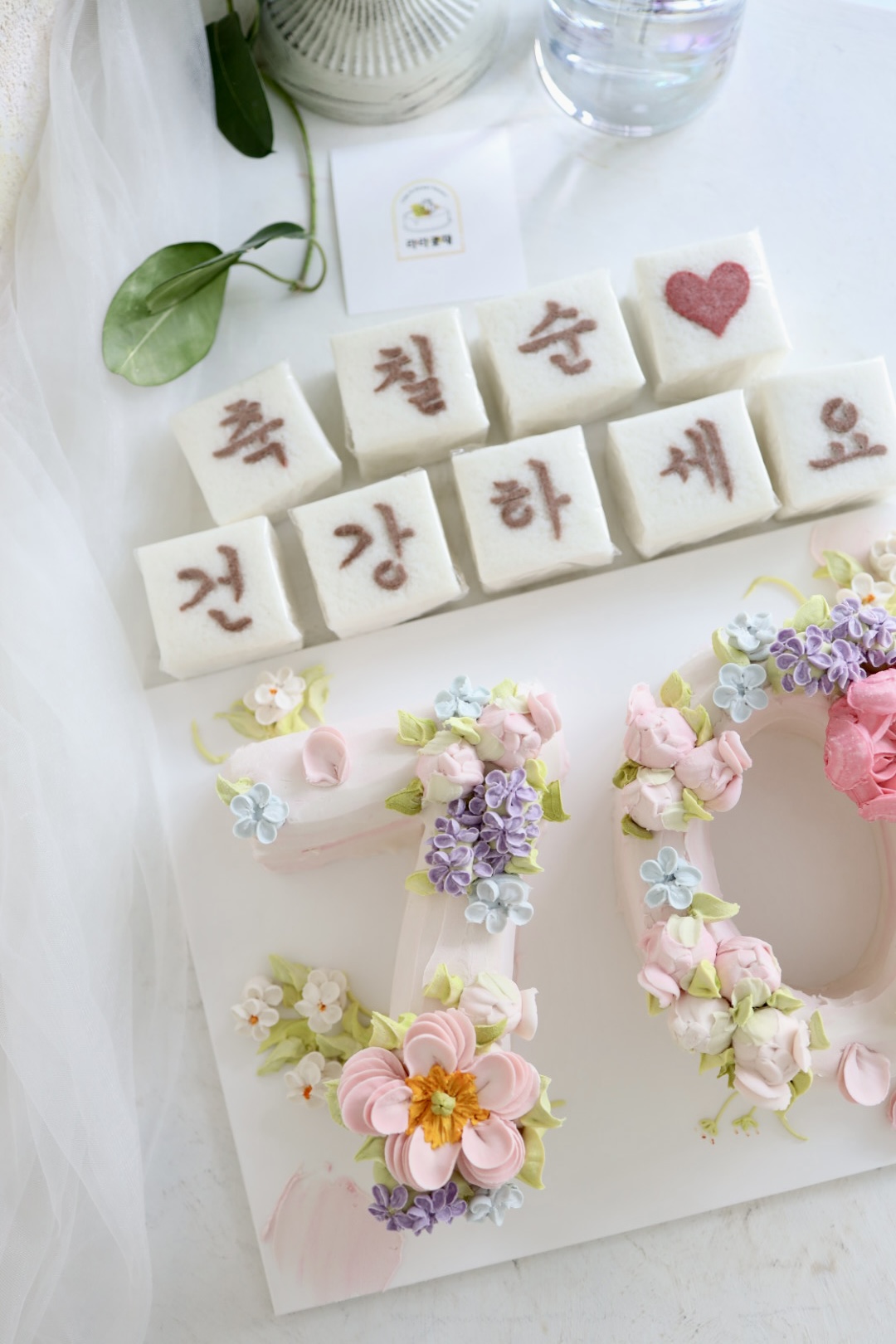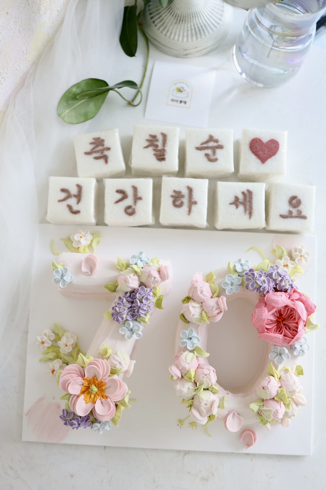 상차림떡 > 상차림떡 70 숫자케이크와 상차림떡 NEW BEST 제품종류 칠순(고희) 판매가 149,000원 보관방법 드시기 전까지 상온보관 소비기한 픽업일 당일 섭취 알레르기 주의 앙금꽃(아황산류,흰강낭콩,유제품), 백설기-패턴글씨(코코아가루, 홍국쌀가루, 딸기가루) 포장단위 숫자케이크(두글자), 백설기(9조각) 1상자 기타 - 백설기 패턴 글씨 변경 가능하고, 패턴 제작이 필요할 경우 별도 추가금액 있습니다. - 단품으로도 주문 가능합니다. - 숫자케이크는 기본 백설기로 제작됩니다. - 숫자케이크 기본구성 : 옆면+윗면 앙금크림 아이싱, 추가금액 없이 투명박스 포장 후 리본(랜덤), 케이크칼(성냥), 숫자초-2개 * 하판레터링은 선택사항으로 별도 추가금액 있습니다. - 하판레터링 출력 후 부착 > 첫 주문시 +1천원 - 하판레터링 12글자 이내 작성 > +3천원 카카오채널 문의하기 카카오채널 문의하기 다음글 > 상차림떡 3종세트 < 이전글 3호 떡케이크와 상차림떡 목록 ▲ ▼