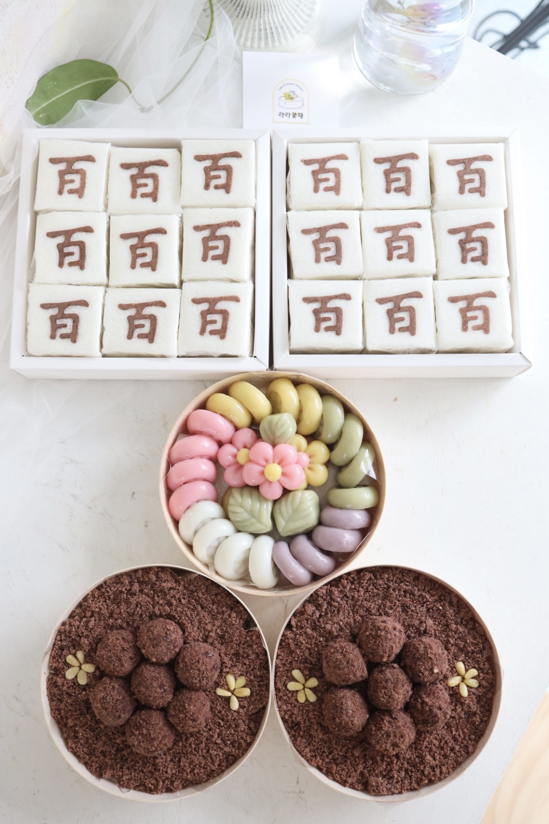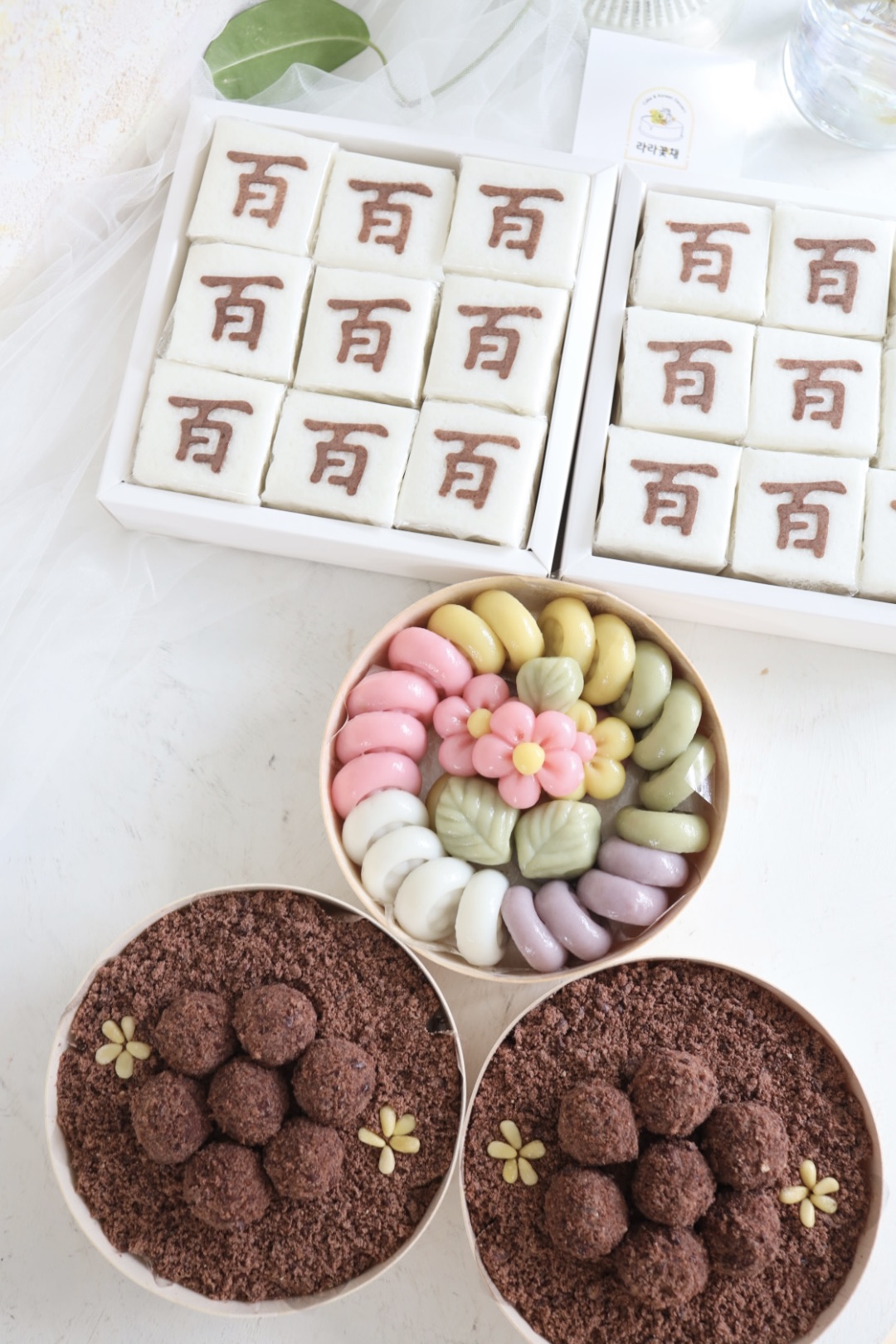 상차림떡 > 상차림떡 백일 상차림떡 3종세트-E NEW BEST 제품종류 백일 판매가 183,000원 보관방법 드시기 전까지 상온보관 소비기한 픽업일 당일 섭취 알레르기 주의 백설기-패턴글씨(코코아가루), 송편(깨,꿀,잣), 찰수수팥떡-팥/장식(잣) 포장단위 백설기(9조각) 2상자, 오색도장송편(30개) 1상자, 찰수수팥떡(27개) 2상자 기타 - 백설기 패턴 글씨 변경 가능하고, 패턴 제작이 필요할 경우 별도 추가금액 있습니다. - 단품으로도 주문 가능합니다. 카카오채널 문의하기 카카오채널 문의하기 < 이전글 상차림떡 5종세트 목록 ▲ ▼
