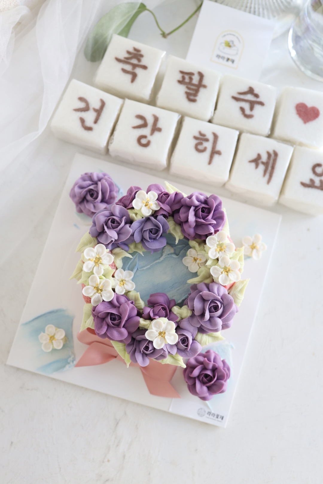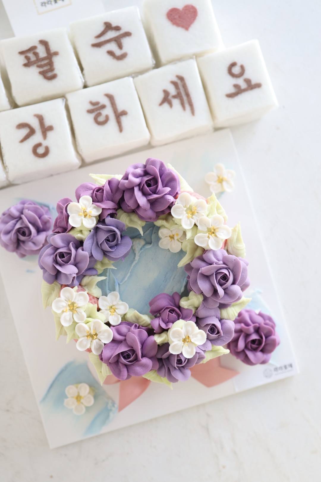 - 앙금꽃-아황산류, 흰강낭콩, 유제품, 백설기-패턴글씨(코코아가루, 홍국쌀가루, 딸기가루)