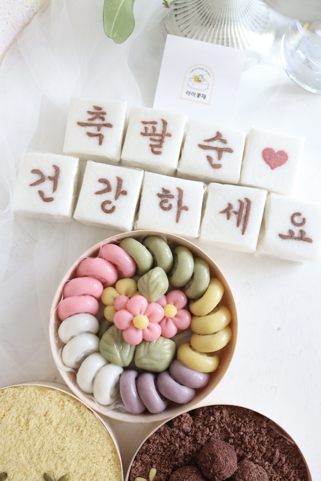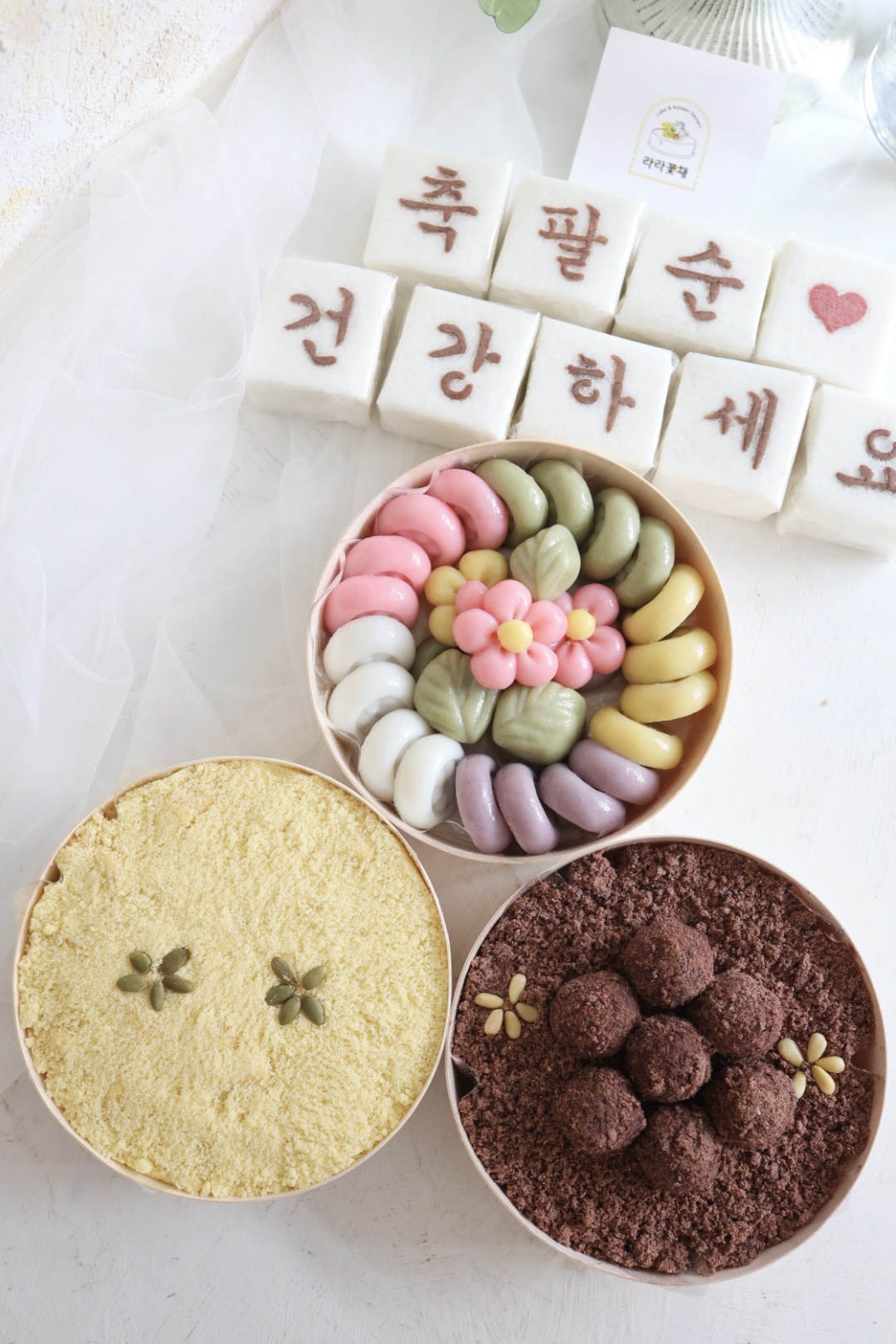 백설기-패턴글씨(코코아가루, 홍국쌀가루, 딸기가루), 송편(깨,꿀,잣), 찰수수팥떡-팥, 장식(잣), 단호박인절미-쌀카스테라고물(밀가루,계란,유제품)/장식(호박씨)