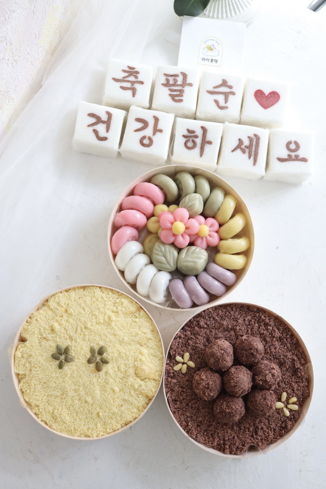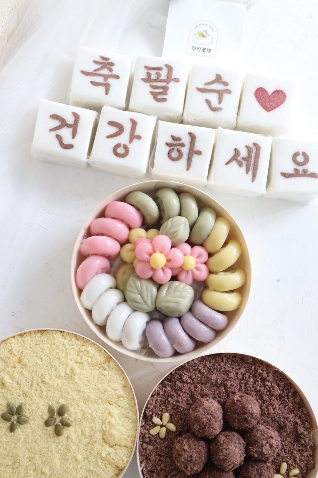 - 백설기-패턴글씨(코코아가루, 홍국쌀가루, 딸기가루), 송편(깨,꿀,잣), 찰수수팥떡-팥, 장식(잣), 단호박인절미-쌀카스테라고물(밀가루,계란,유제품)/장식(호박씨)