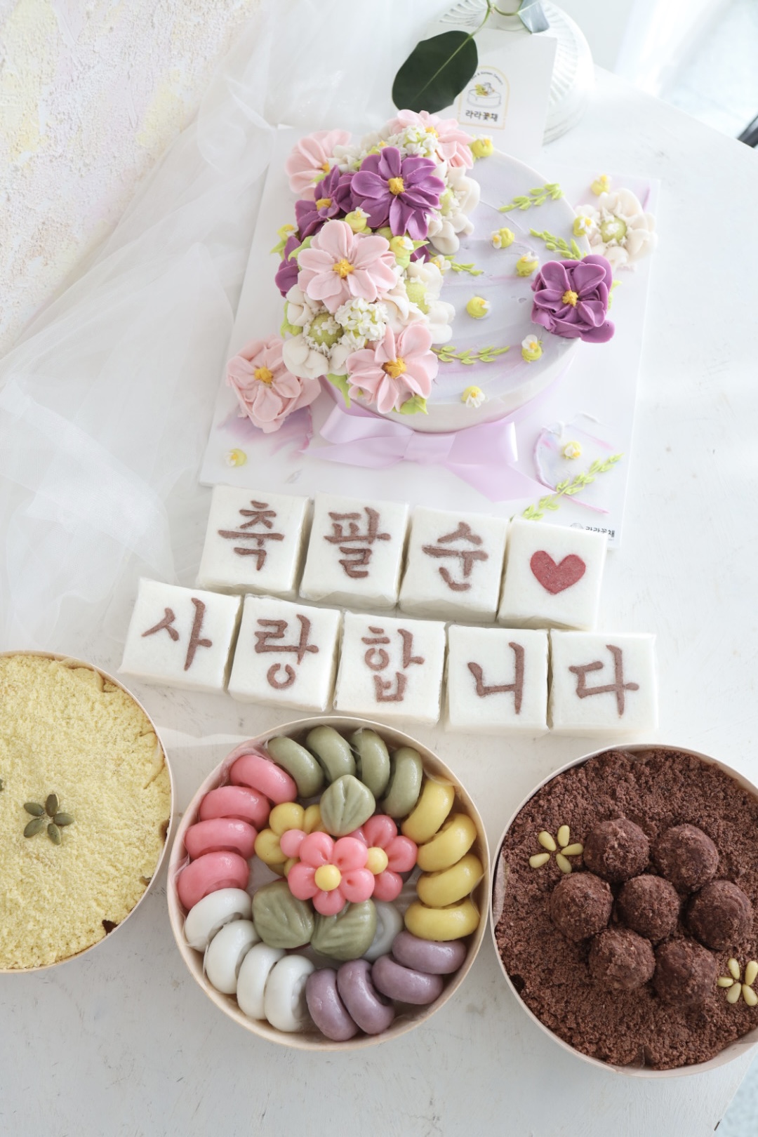 - 앙금꽃(아황산류,흰강낭콩,유제품), 백설기-패턴글씨(코코아가루, 홍국쌀가루, 딸기가루), 송편(깨,꿀,잣), 찰수수팥떡-팥/장식(잣), 단호박인절미-쌀카스테라고물(밀가루,계란,유제품)/장식(호박씨)