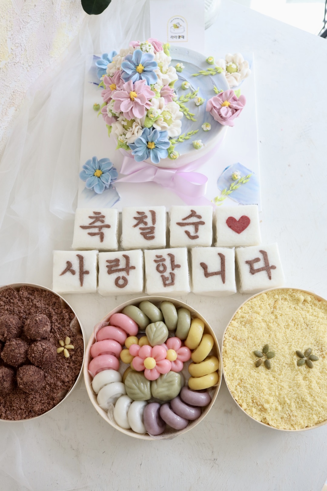 - 앙금꽃(아황산류,흰강낭콩,유제품), 백설기-패턴글씨(코코아가루, 홍국쌀가루, 딸기가루), 송편(깨,꿀,잣), 찰수수팥떡-팥/장식(잣), 단호박인절미-쌀카스테라고물(밀가루,계란,유제품)/장식(호박씨)