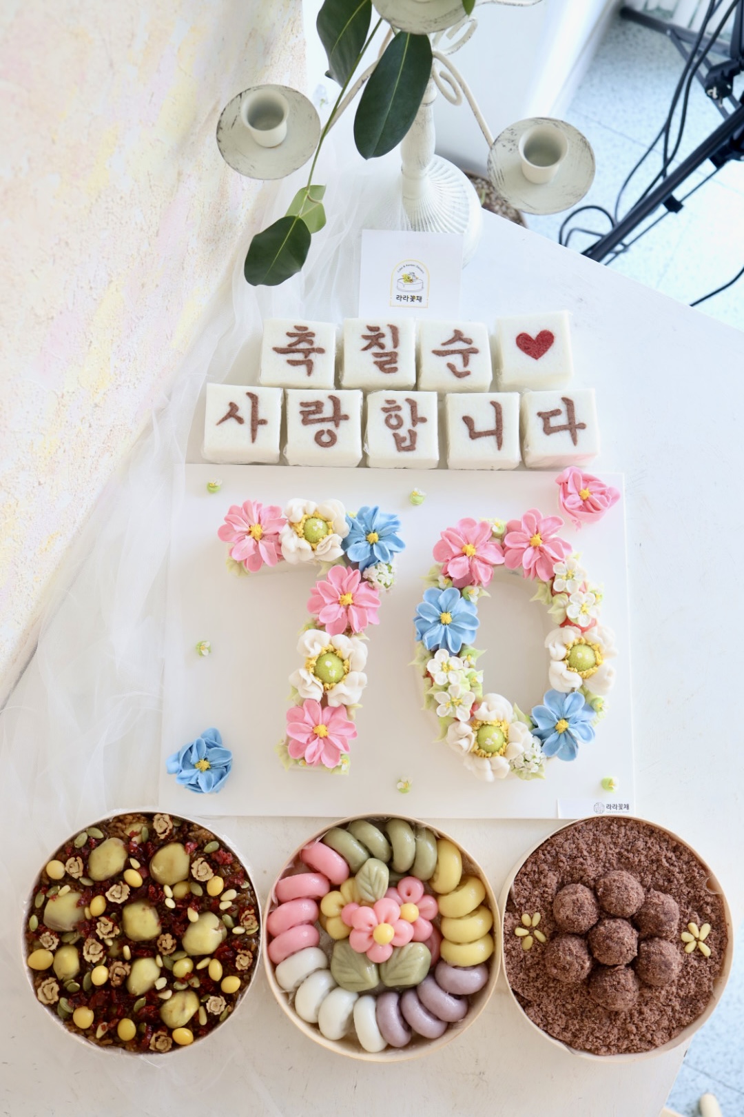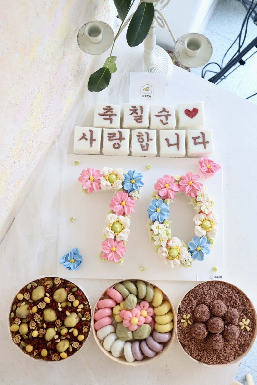 숫자케이크(두글자) / *하판사이즈 : 가로37.5*세로28cm, 백설기(9조각) 1상자, 오색도장송편(30개) 1상자, 찰수수팥떡(27개/650g) 1상자, 전통약식(850g) 1상자