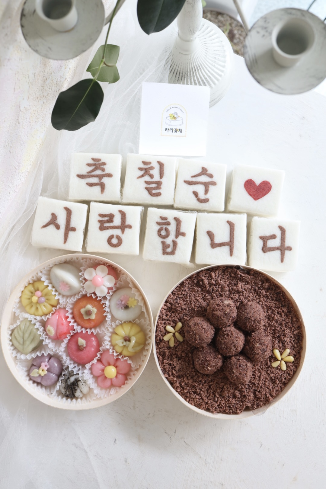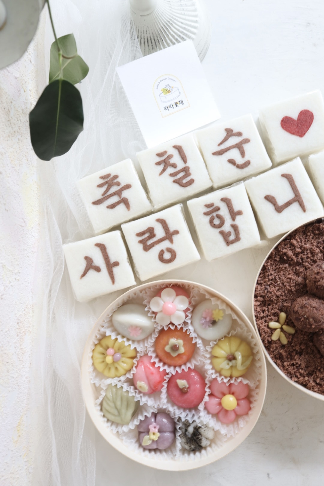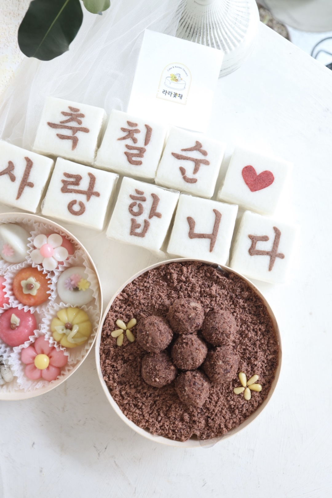 - 백설기-패턴글씨(코코아가루, 홍국쌀가루, 딸기가루)/장식(잣,대추,호박씨), 송편(깨,꿀,잣), 찰수수팥떡-팥/장식(잣)