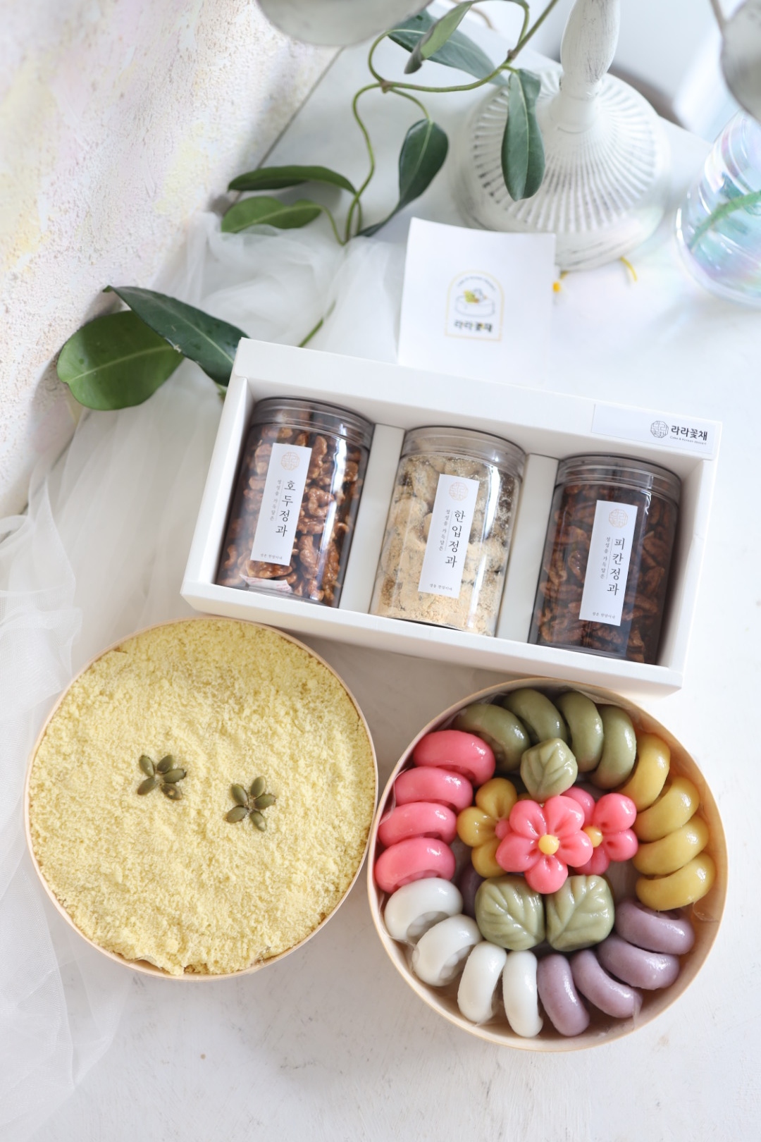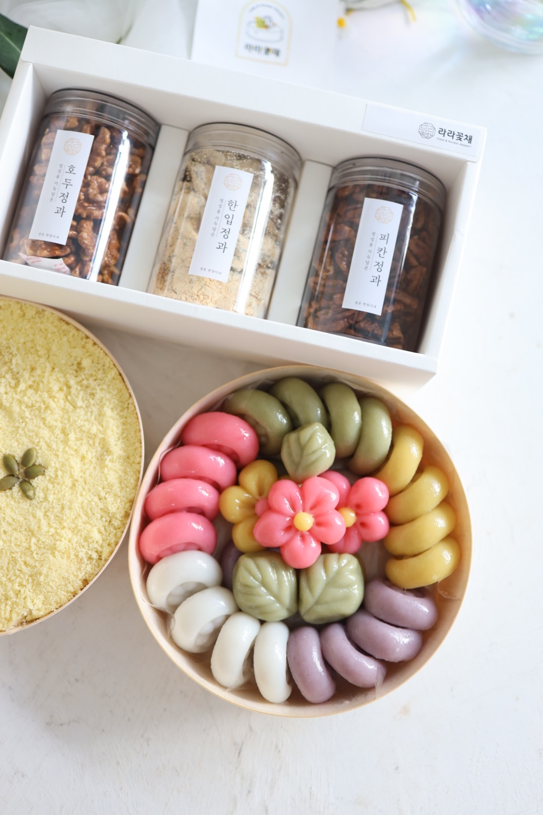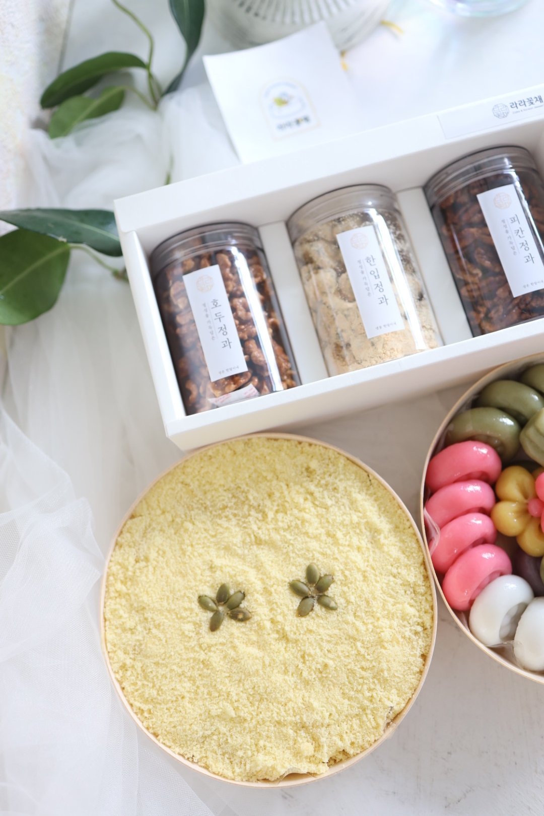 - 정과 3종세트(호두정과, 피칸정과-상온 한달 이내, 한입정과-냉동 한달 이내), 떡류(픽업일 당일 섭취)